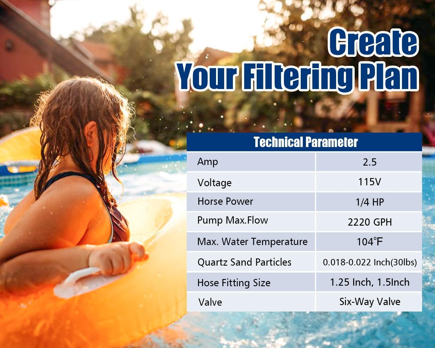 Efficient Operation, Large Capacity-1/4HP runs smoothly, low noise, with overheat protection device, 10″ filter tank can hold 30 lbs of sand, suitable for all types and sizes of swimming pools. High-performance 1/4HP pool pump energy-efficient motor features thermal protection, delivering 2220GPH flow with 22ft lift capacity while maintaining quiet operation.