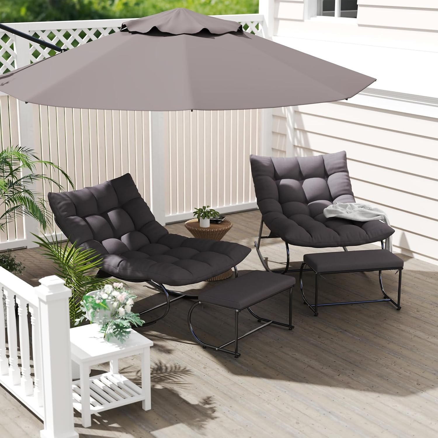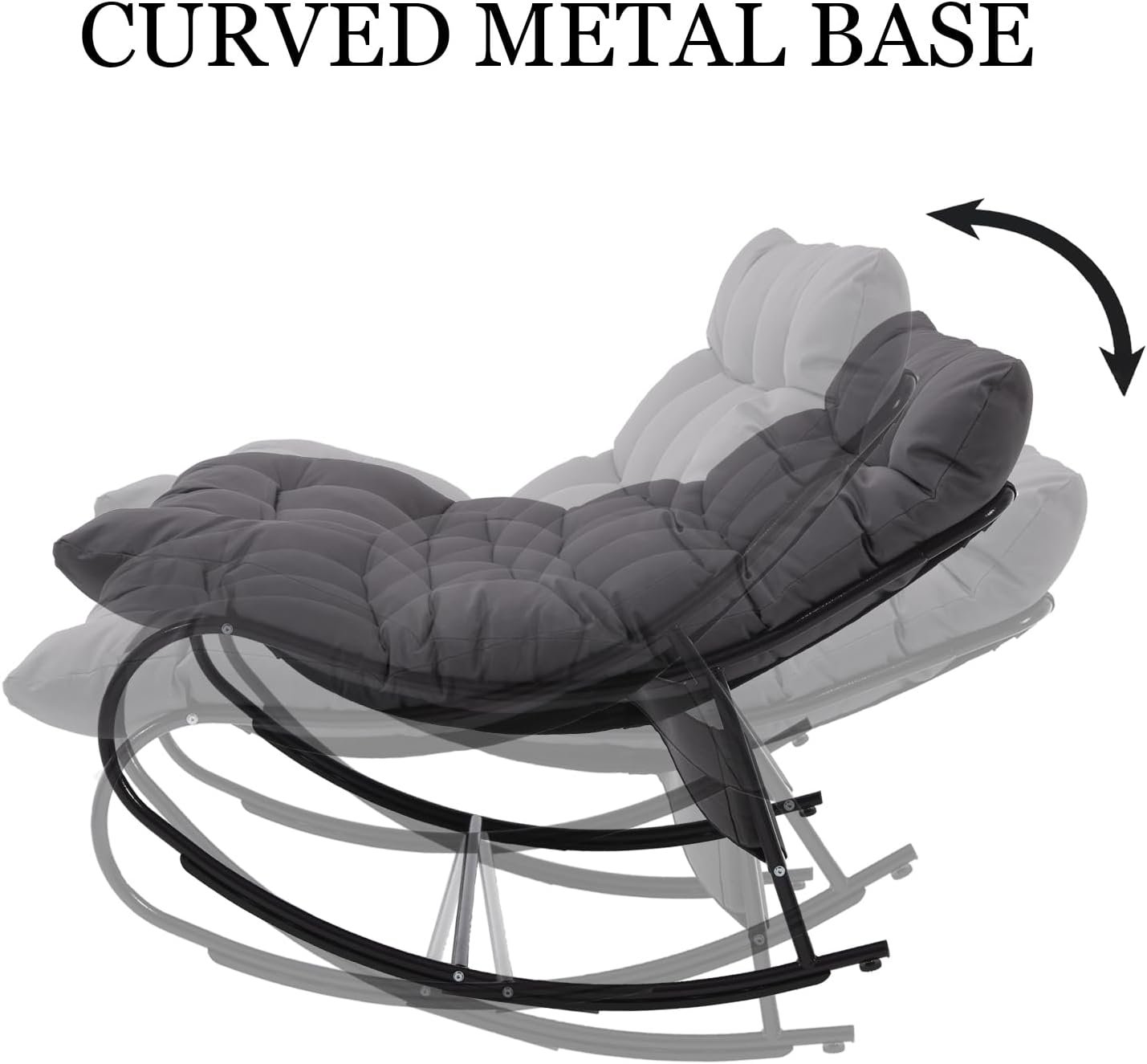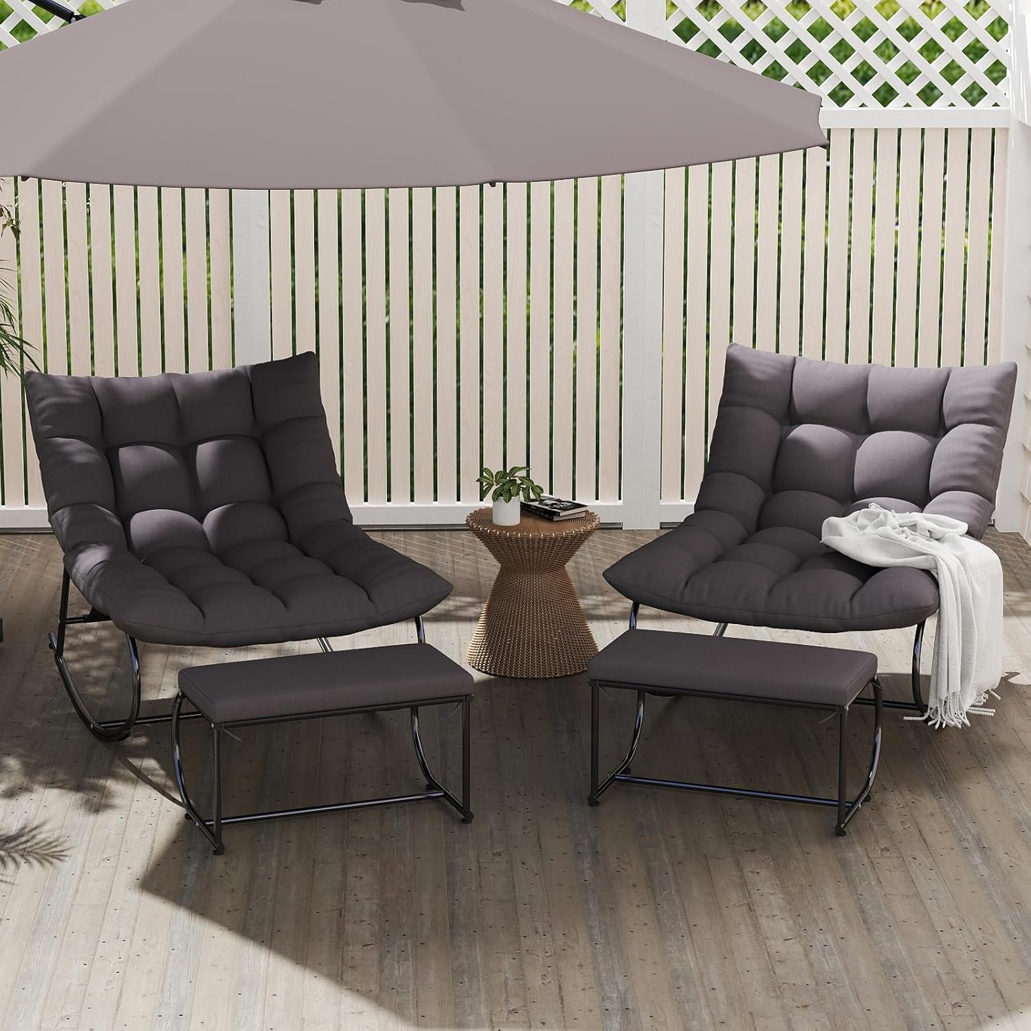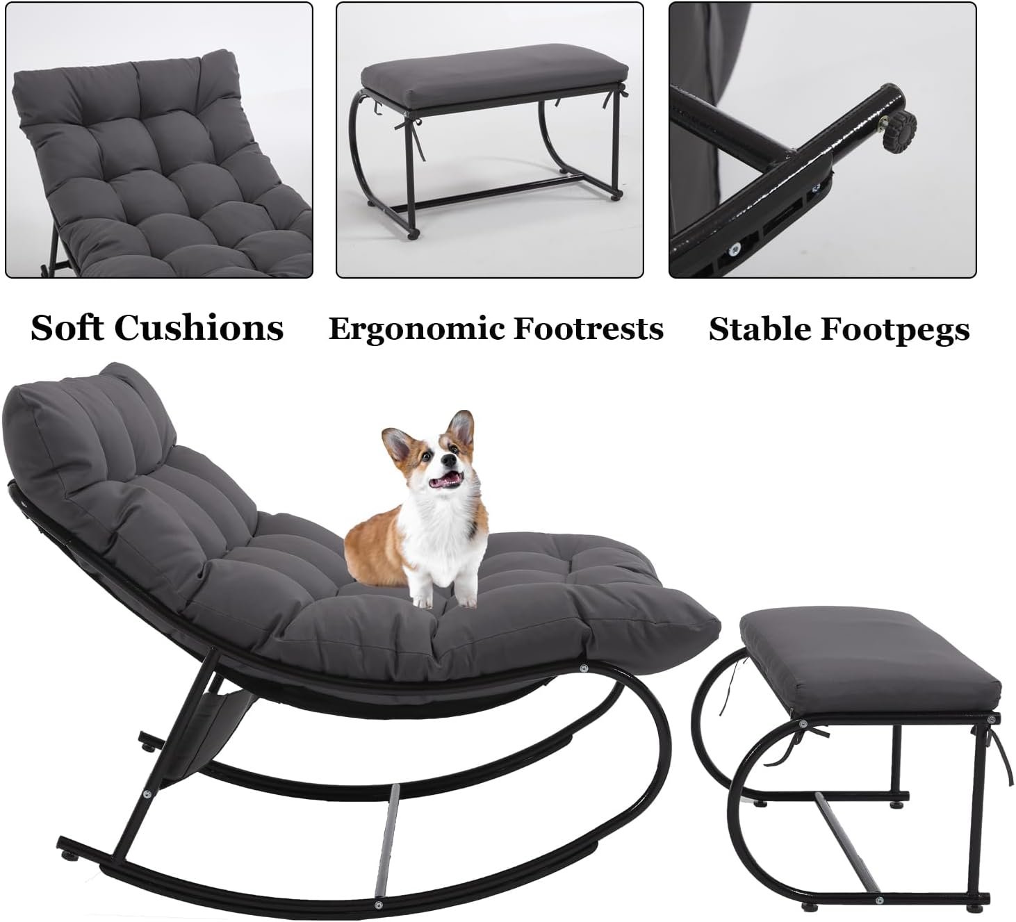 2 Piece Outdoor Rocking Chairs with Ottoman, Patio Oversized Rocking Egg Chair with Cushion, Papasan Chair Set of 2 for Outside, Outdoor Padded Chairs, Grey